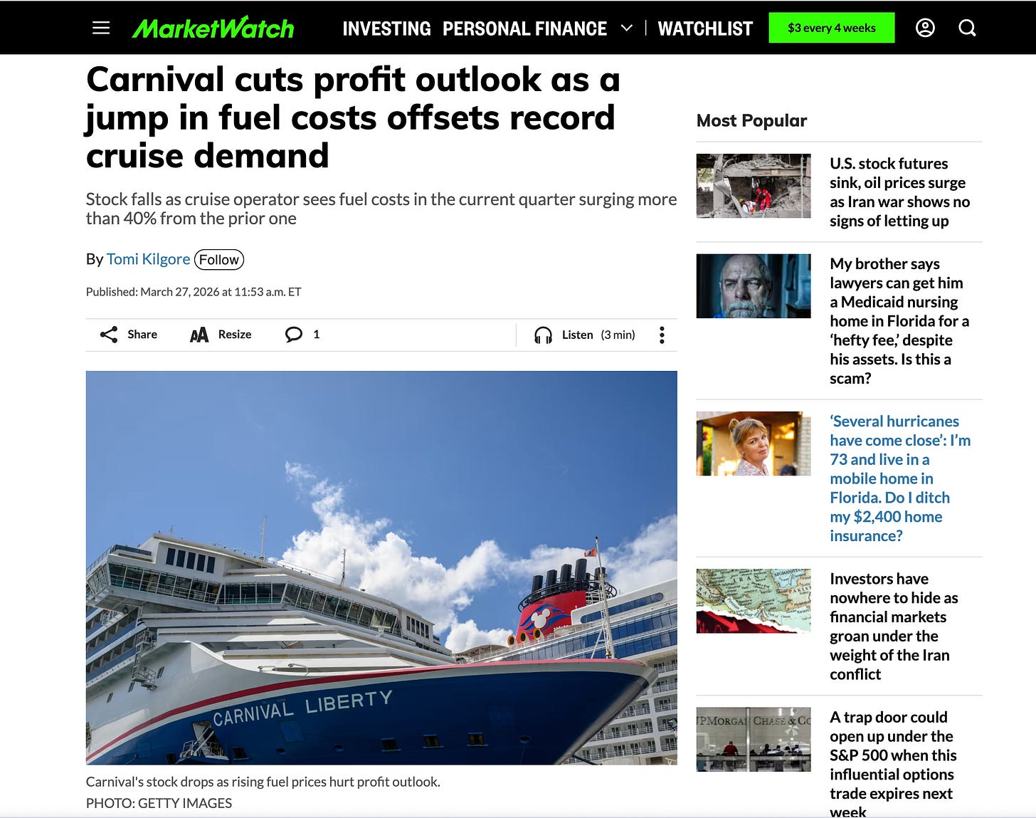 https://financialpost.com/news/gulf-oil-gas-producers-face-25-billion-repair-bill#:~:text=Posthaste:%20Middle%20East%20oil%20faces,%2C%20Gabriel%20Friedman%2C%20and%20others.Kilgore, Tomi「Carnival cuts profit outlook as a jump in fuel costs offsets record cruise demand」MarketWatch、2026年3月27日