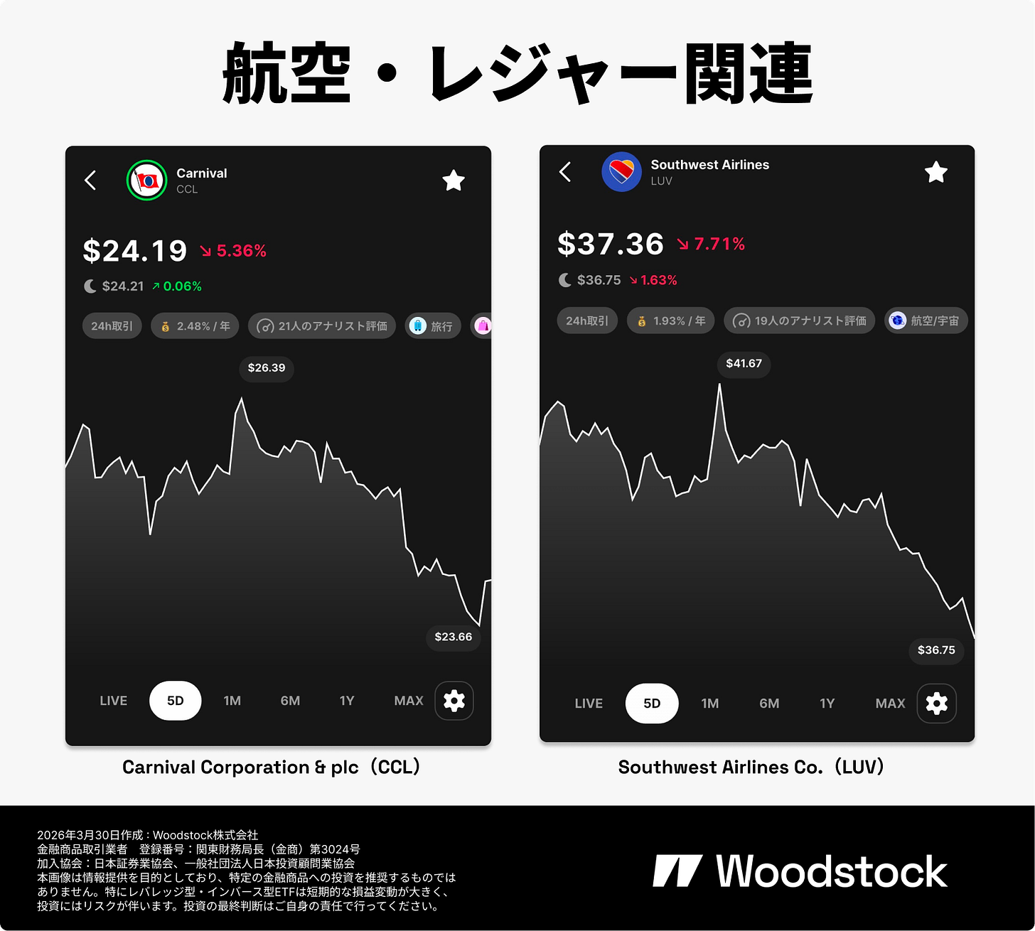 同社は3月28日の決算で、燃料費急騰を受けて通期EPSを約2.48ドルから約2.21ドルに引き下げました。5億ドル超の燃料コスト増が見込まれ、株価は直近30日で約17%下落しています。