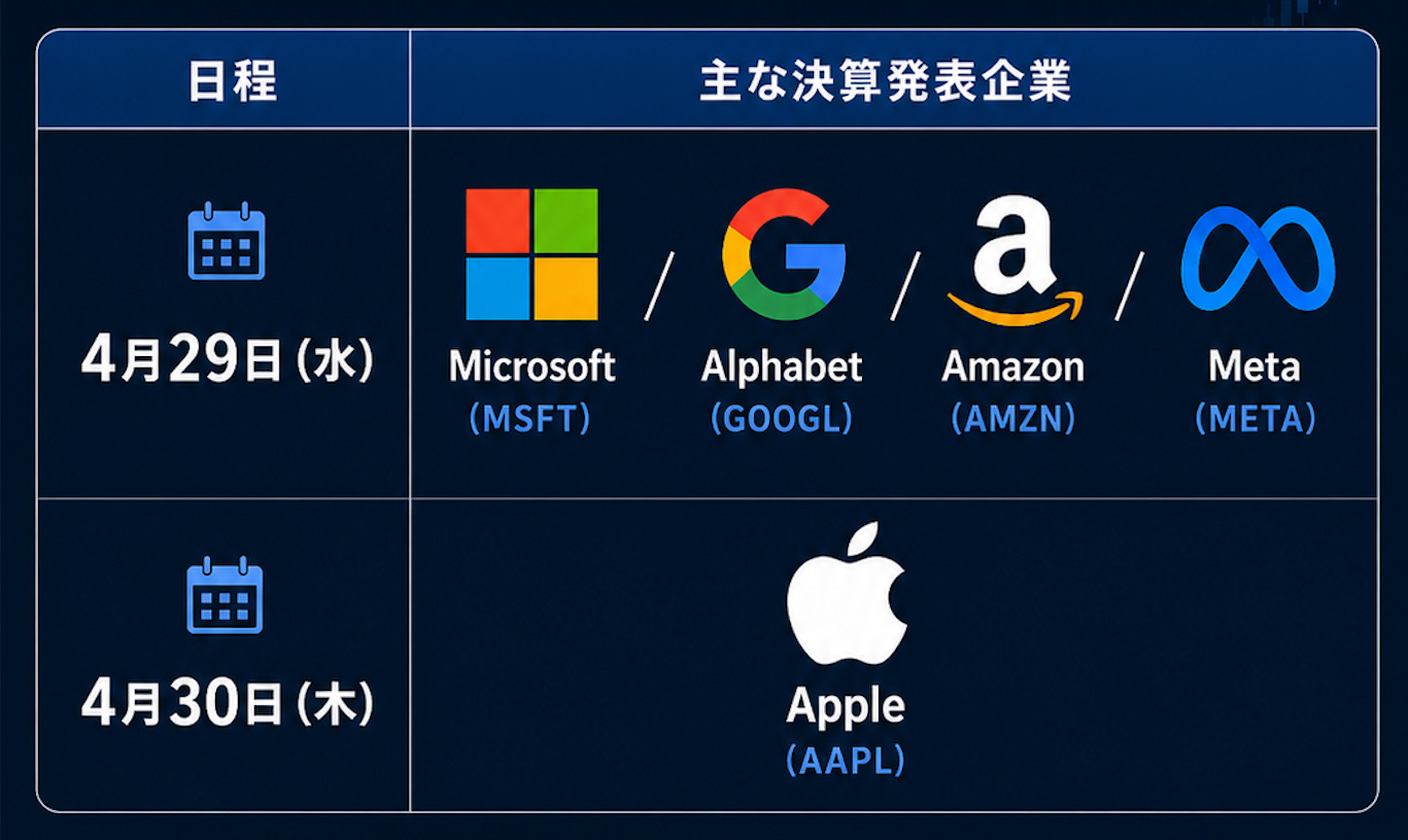 4月29日(水)にはMicrosoft($MSFT)、Alphabet($GOOGL)、Amazon($AMZN)、Meta($META)が決算を発表予定。