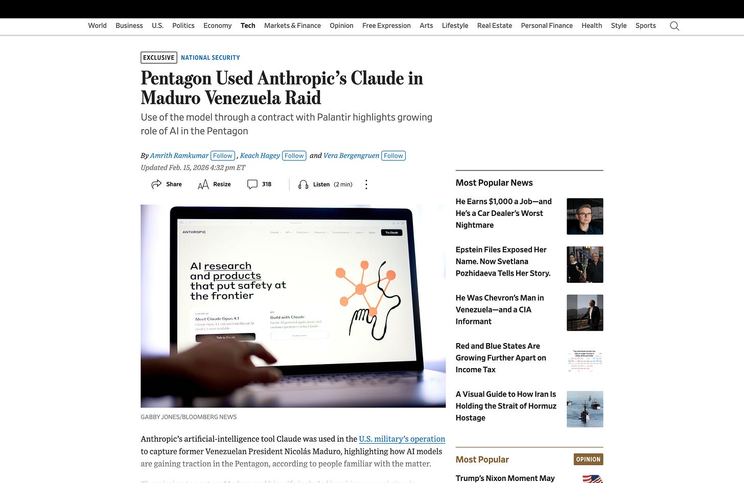 The Wall Street Journal. “Pentagon Used Anthropic’s Claude in Maduro Venezuela Raid.” 2026. https://www.wsj.com/politics/national-security/pentagon-used-anthropics-claude-in-maduro-venezuela-raid-583aff17